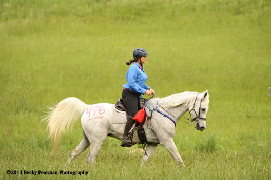44 horses and riders started the AERC 75-mile ride, with 35 completing the 75-mile course, a 79.5% completion rate (compared to 77% in 2012, 71% in 2011, 53% in 2010 and 65% in 2009). Completion awards were twentieth anniversary, full color T-shirts sponsored by Southern States / Triple Crown Feed and Ken Wilson Ford.